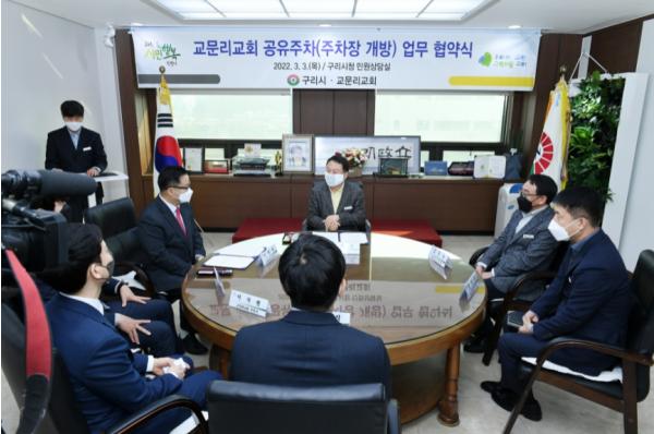 [한국뉴스타임=편집국] 구리시와 교문리 교회는 3일 시청 3층 상황실에서 교문리교회 부설주차장을 구리시 종교시설 최초로 공유주차장으로 지정하고, 향후 5년 동안 지역주민을 위해 주차 공간을 개방하기로 하는 협약을 체결했다.
