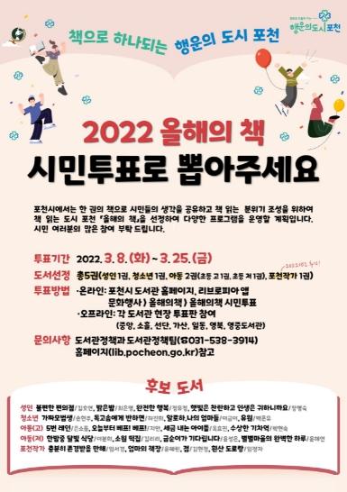 [한국뉴스타임=편집국] 포천시는 오는 8일부터 3월 25일까지 포천시민이 함께 읽을 ‘2022년 포천시 올해의 책’ 후보 도서를 시민들의 투표로 선정한다.