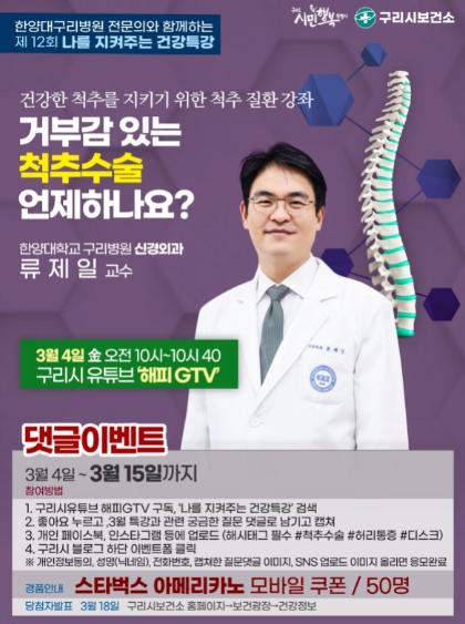 [한국뉴스타임=편집국] 구리시는 4일 구리시 공식 유튜브 ‘해피GTV’를 통해 ‘한양대구리병원 전문의와 함께하는 나를 지켜주는 건강특강’제 12회 ‘거부감이 있는 척추수술 언제 해야 하나요?’를 방송했다.