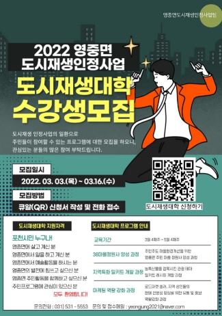 2022년 도시재생대학은 ▲마을 환경개선 및 도로 정원관리 주체를 육성하는 ‘38마을정원사 양성과정’ ▲캠퍼, 관광객 등을 대상으로 한 특화상품 개발인 ‘공유부엌 운영 및 지역특화 밀키트 개발 과정’ ▲영중면 로드마켓 셀러와 지역 상인들의 역량강화와 상권활성화를 위한 `마케팅 전문 역량강화 과정’ 등으로 진행된다.