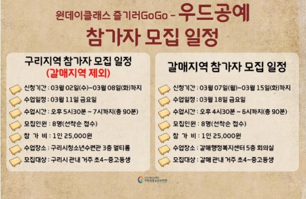 3월 원데이클래스 ? 우드공예 프로그램은 구리시청소년수련관, 갈매행정복지센터에서 매월 각 1회씩 이원화로 운영한다.
