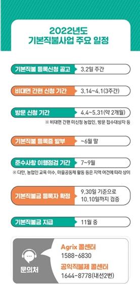 [한국뉴스타임=편집국] 경기도가 오는 14일부터 5월 31일까지 ‘2022년 기본형 공익직불금’ 접수를 진행한다. ‘기본형 공익직불금’은 농업활동을 통해 식품안전, 환경보전, 농촌유지 등 공익 창출을 유도하고 농업인의 소득안정을 위해 농업경영정보를 등록한 농업인·농업법인에게 지급되는 보조금이다.