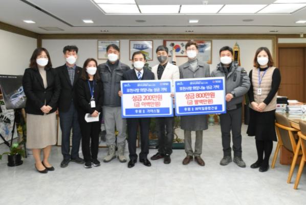 [한국뉴스타임=편집국] 포천시는 지난 7일 ㈜덕일종합건설(대표 이상덕)과 가야스틸(대표 박수홍)에서 관내 소외된 계층 지원을 위해 이웃 돕기 성금 각 800만 원과 200만 원을 경기사회복지공동모금회를 통해 기탁했다고 밝혔다.