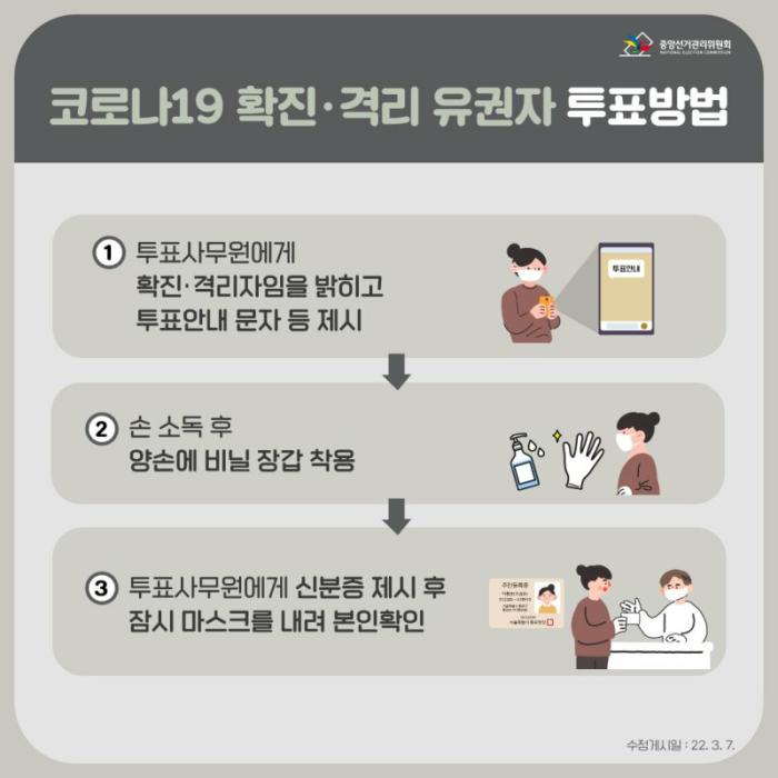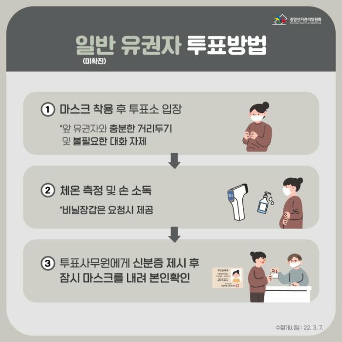 유권자들은 마스크를 착용한 채 투표소에 도착해 주민등록증이나 운전면허증, 여권 등 신분증을 제시해야 투표를 할 수 있다. 확진·격리 유권자는 보건소에서 받은 투표안내 문자 원본을 보여줘야 한다.