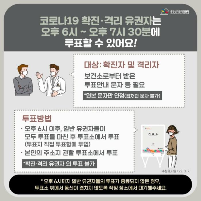 중앙선거관리위원회는 3월 9일 투표일에 일반유권자는 오전 6시부터 오후 6시까지, 코로나19 확진·격리 유권자는 오후 6시부터 오후 7시30분까지 투표할 수 있다고 밝혔다.