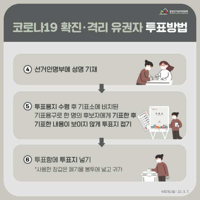또한 지난 5일 확진자 등이 사전투표에서 임시기표소에서 기표한 투표용지를 투표사무원에게 전달해 투표함에 대리로 넣던 방법과 달리 자신이 기표한 투표지를 직접 투표함에 투입하게 된다.