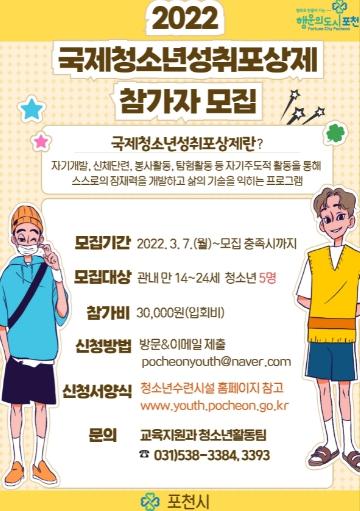 모집대상은 포천시 관내 거주하는 만 9세~24세 청소년 총 5명이다. 모집기간은 3월 7일(월)부터 모집 충족 시까지다.