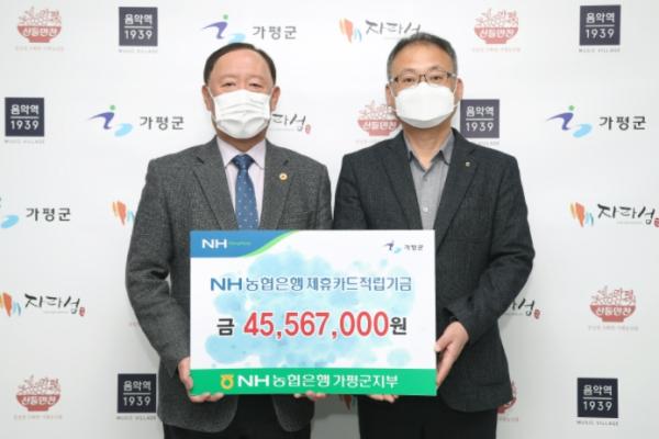 [한국뉴스타임=편집국] 오는 8일 NH농협은행 가평군지부는 가평군에 제휴카드 적립기금을 전달하였다.