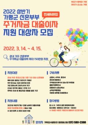 [한국뉴스타임=편집국] 가평군이 오는 3월 14일부터 4월 15일 18시까지 2022년 상반기 신혼부부 주거자금 대출이자 지원 사업을 실시한다. 가평군에 거주하는 신혼부부의 주거부담 완화를 위하여 2021년 하반기에 납부한 전세자금, 매입자금의 대출이자를 최대 150만원 지원한다.