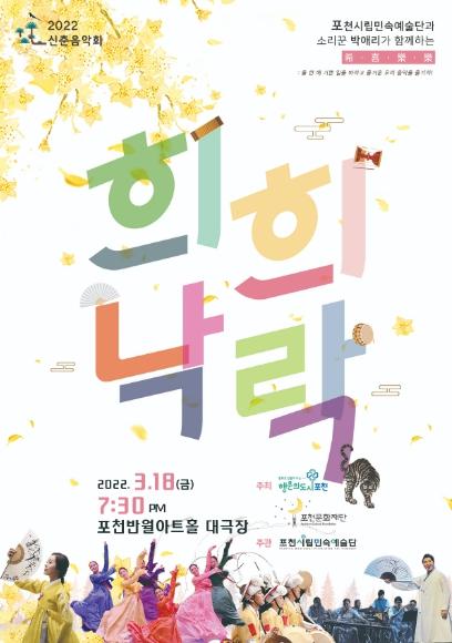 [한국뉴스타임=편집국] 포천시립민속예술단은 오는 18일 오후 7시 30분 포천반월아트홀 대극장에서 신춘음악회 ‘희희낙락(希喜樂樂)’ 공연을 마련한다고 한다.