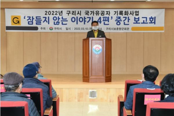 [한국뉴스타임=편집국] 구리시는 10일 구리시 보훈향군회관 대강당에서 2022년 국가유공자 기록화사업 ‘잠들지 않는 이야기 4편’중간보고회를 개최했다고 밝혔다.