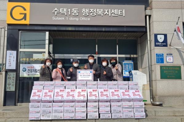 [한국뉴스타임=편집국] 구리시 10일 수택1동행정복지센터(동장 박영균)에서 나눔 봉사단체 ‘착한사람’(대표 박수근)으로 부터 라면 100상자를 전달 받았다.