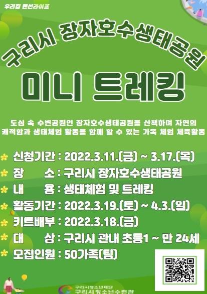 ‘미니트레킹’ 프로그램은 도심 속 수변공원인 장자호수생태공원을 산책하며 자연의 쾌적함을 느끼고, 또한 기존의 구리 둘레길과 연계된 힐링 산책로에서 가족과 함께 미니 트레킹 및 생태체험관 체험활동을 할 수 있는 프로그램이다.