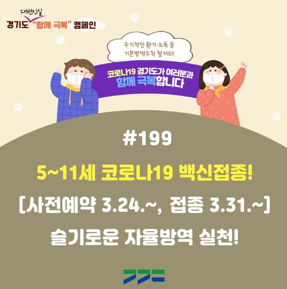 이와 함께 정부가 소아?청소년 접종 계획을 발표한 것과 관련, 5~11세 소아 기초접종은 생일이 지나지 않은 2010년생부터 생일이 지난 2017년생까지가 해당되며, 소아용 화이자 백신을 통해 도내 329개 지정 위탁의료기관에서 접종 가능하다. 오는 24일부터 예방접종 누리집을 통해 사전 예약을 진행하고, 접종은 31일부터 개시할 예정이다.