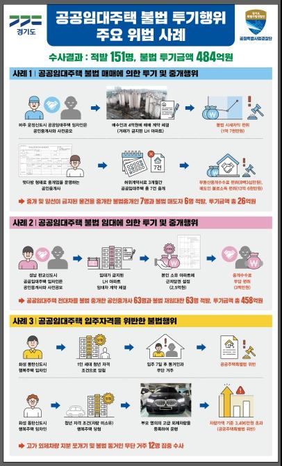 [한국뉴스타임=편집국] 매매나 재임대가 금지된 공공임대주택을 시세차익을 노리고 불법으로 매매?임대한 불법 투기자와 공인중개사, 입주자격 위반행위자 등 151명이 경기도 특사경에 적발됐다. 이들이 투기한 금액은 484억 원에 달한다.