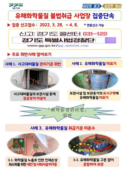 [한국뉴스타임=편집국] 경기도 민생특별사법경찰단이 화학사고 예방을 위해 3월 28일부터 4월 8일까지 도내 유해화학물질 취급 허가업체의 무허가 영업 등 불법행위를 집중 수사한다. 수사 대상은 도내 유해화학물질 취급 허가업체 360개소다.
