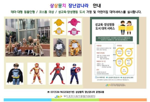 [한국뉴스타임=편집국] 포천시육아종합지원센터 상상뭉치 장난감나라에서는 3월부터 포천시 관내 가정 및 어린이집을 대상으로 ‘테마?대형 동물 인형, 코스튬 의상, 성교육 및 양성평등 교육 도서 대여 서비스를 실시한다.