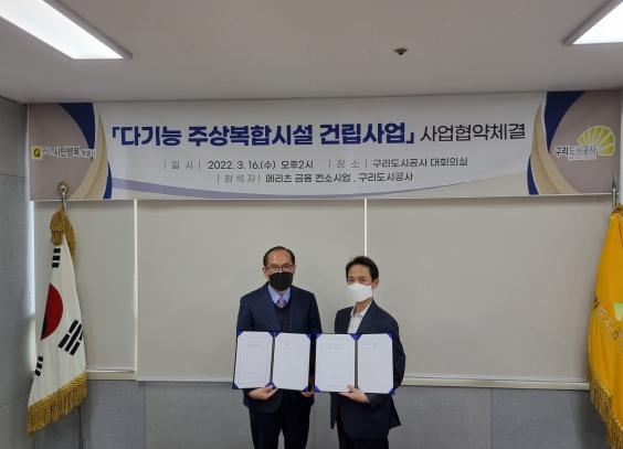 [한국뉴스타임=편집국] 구리시는 16일 구리도시공사 대회의실에서 구리도시공사가 ‘다기능 주상복합시설 건립사업’우선협상대상자인 메리츠금융 컨소시엄 대표사 메리츠증권(본부장 김석순)과 사업협약을 체결했다고 밝혔다.