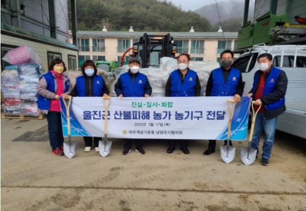 바르게살기운동 남양주시협의회 임원들은 십시일반 자율적으로 모은 성금으로 520만원 상당의 삽 400자루 마련해 울진군 농업기술센터에 전달했으며, 이날 전달된 삽은 농가 지원 및 피해복구 작업에 쓰일 예정이다.