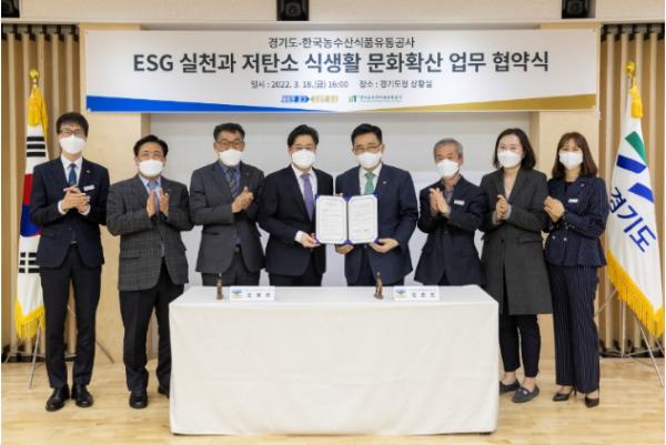 오병권 경기도지사 권한대행과 김춘진 한국농수산식품유통공사(aT) 사장은 18일 경기도청에서 환경?사회?지배구조(ESG) 실천과 저탄소 식생활 확산 및 지역경제 활성화를 위한 업무협약을 체결했다.
