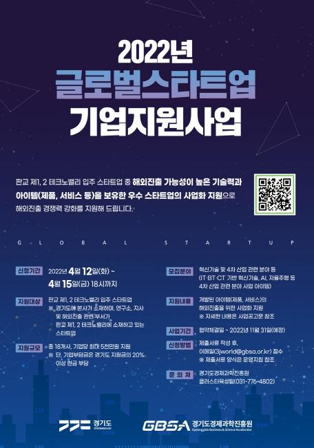 경기도경제과학진흥원은 해외 진출을 희망하는 판교 제1,2테크노밸리 입주 새싹기업을 대상으로 ‘글로벌 스타트업 기업지원사업’ 참가기업을 모집한다고 20일 밝혔다.