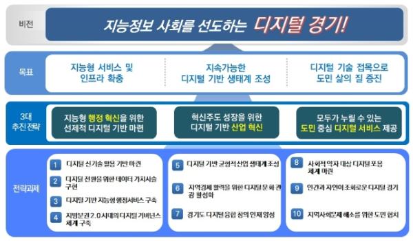 도는 이번 기본계획에서 ‘지능정보 사회를 선도하는 디지털 경기!’를 비전으로 사업비 1,225억 원을 투입해 ▲지능형 행정 혁신을 위한 선제적 디지털 기반 마련 ▲혁신주도 성장을 위한 디지털 기반 산업 혁신 ▲모두가 누릴 수 있는 도민 중심 디지털 서비스 제공 등 3대 추진전략과 10대 전략과제, 39개 이행과제를 추진할 방침이다.