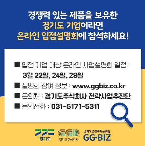 경기도주식회사는 이번 ‘지지비즈(GGBIZ)’ 오픈과 운영에 앞서 22일과 24일, 29일 총 3일간 온라인 줌(ZOOM)을 통해 입점을 희망하는 도내 기업을 대상으로 온라인 입점 설명회를 개최한다.