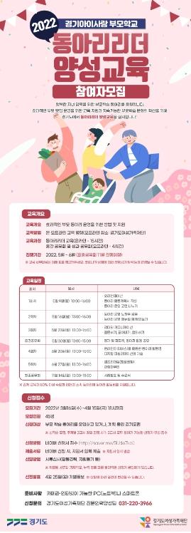 경기도에서 수탁받아 진행하는 ‘경기아이사랑 부모학교’는 핵가족화?맞벌이?한부모 등 가족 형태 다양화에 따른 맞춤형 부모교육 지원으로, 이번 동아리리더 양성교육 과정은 바람직한 자녀양육 문화 확대를 위한 부모모임 운영 관련 온?오프라인 교육을 지원하는 내용이다.