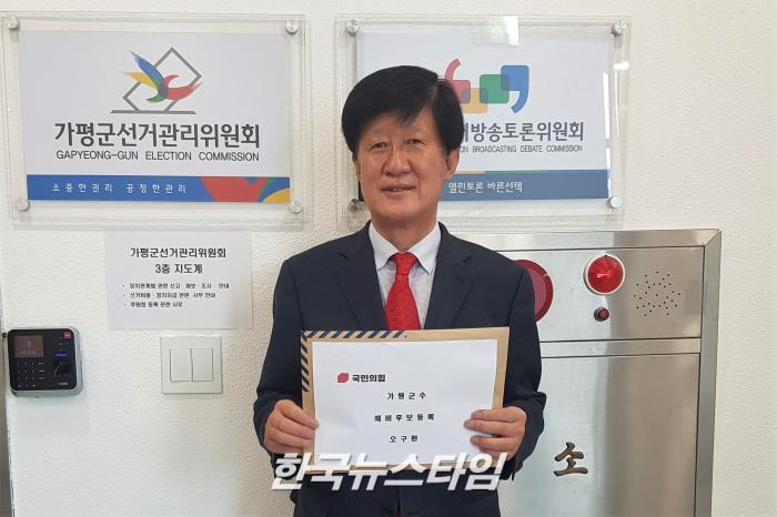 [한국뉴스타임=편집국] 국민의힘 오구환 전 도의원이 22일, 가평군선관위에 6.1 지방선거 가평군수 예비후보 등록을 마치고 본격적인 선거운동에 나섰다.