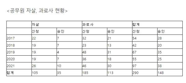 공무원 순직 중 자살의 경우 2021년 62건 중 10건으로 16.1%나 차지해서 충격을 주고 있다. 매년 거의 7명 가량씩 발생하다가 2021년은 10명이 발생한 것이다. 2020년 산재보험에서 1만 명당 0.03명 자살 산재가 발생하는데, 공무원은 1만 명당 0.06명으로 일반 산재보험 적용 노동자들에 비해서 약 2배 정도 자살산재율이 높은 것인데, 2021년은 1만명당 0.08명으로 2.5배정도 자살산재율이 높게 나타났다. 사망에 이르지는 않았지만 정신질환 공무상 요양의 경우도 2019년 178명, 2020년 153명, 2021년 167명으로 상당한 수에 이른다. (2020년 산재보험 대상자 수 1897만4513명 중 61명 자살, 공무원 122만1322명 중 7명 자살)