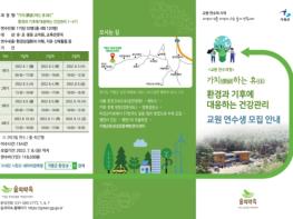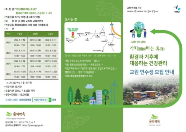 [한국뉴스타임=편집국] 가평군 환경성질환 예방관리센터에서 숲의 약속 “가치(價値)하는 휴(休)” 환경과 기후에 대응하는 건강관리 특수분야 교원 연수 참여자를 오는 7월 8일까지 모집 한다.