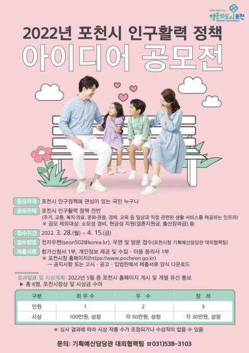 [한국뉴스타임=편집국] 포천시는 인구감소 및 지방소멸에 효과적으로 대응하고 시민과 함께 지역 특성에 맞는 인구활력 증진사업을 발굴하고자 ‘2022년 포천시 인구활력 정책 아이디어 공모전’을 개최한다.