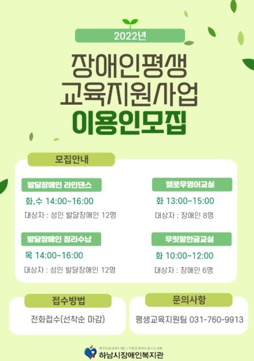 2022년 장애인평생교육지원사업은 하남시 거주 장애인이라면 누구나 신청 가능하다.
