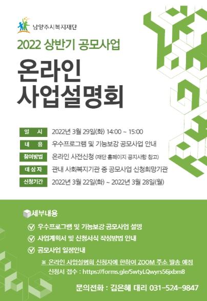 [한국뉴스타임=편집국] 남양주시복지재단이 관내 사회복지시설을 대상으로 오는 29일 오후 2시‘2022년 상반기 공모사업 온라인 사업설명회’를 개최한다.