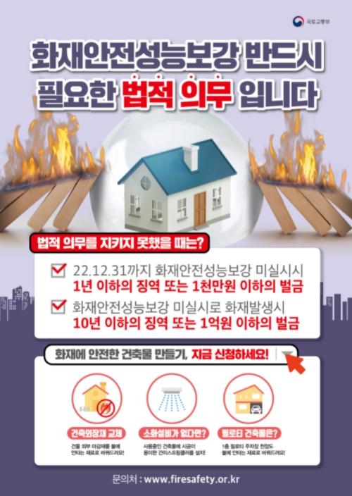 한편, 시는 동 기간 내 화재안전성능보강 의무 대상 건축물이 보강을 미 실시할 경우 1년이하의 징역 또는 1천만원 이하의 벌금이 부과되므로 주의해야 한다고 당부했다.