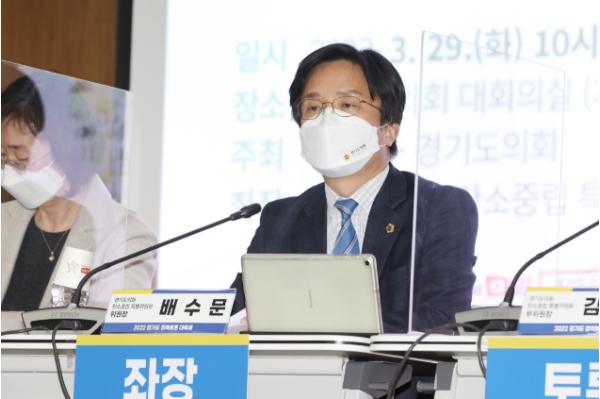 [한국뉴스타임=편집국] 경기도의회 배수문 위원(더불어민주당, 과천시)이 좌장을 맡은'2050년 탄소중립 실현을 위한 경기도 이행방안 모색' 토론회가 3월 29일(화) 경기도의회 대회의실에서 개최됐다. 이번 토론회는 경기도와 경기도의회가 공동 주최한‘2022 경기도 상반기 정책토론 대축제’의 일환으로, 탄소중립 실현을 위한 경기도 이행방안을 논의하는 자리로 개최됐다.