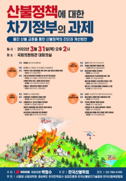 [한국뉴스타임=편집국] 31일 오후 2시 국회의원회관 대회의실에서 ‘박형수 국회의원 주최로 '산불정책에 대한 차기정부의 과제' 정책토론회’가 개최된다. 한국산불학회(회장 문현철) 주관으로 열리는 이날 토론회는 ‘울진 산불의 교훈을 통한 산불정책의 진단과 개선방안’을 도출해 차기정부의 산불정책 과제로 제시한다는 목적을 두고 있다.