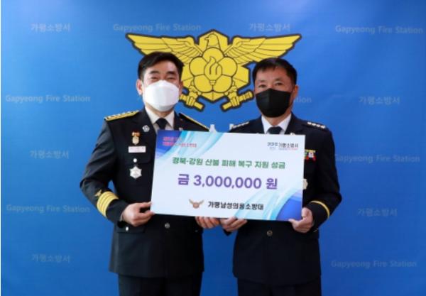 [한국뉴스타임=편집국] 가평소방서는 30일 가평남성의용소방대가 역대 최대 피해 규모의 상처를 남긴 경북·강원 산불 이재민들에게 전달해 달라며 성금 300만원을 경기 사회복지공동모금회에 전달했다고 밝혔다.