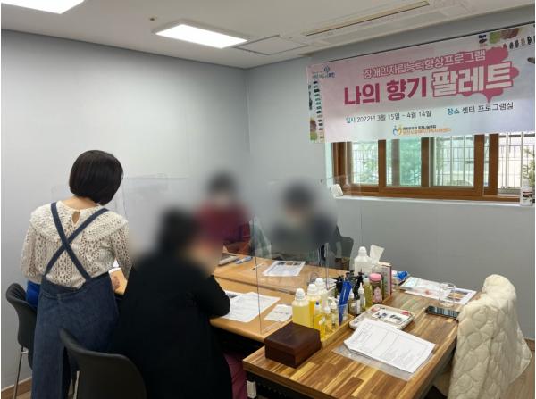 ‘나의 향기 팔레트’는 장애인 당사자가 다양한 천연재료를 선택해 개성 있는 화장품, 향수, 비누 등 다양한 작품을 만들고, 이론과 체험 병행을 통해 공예 강사라는 직업에 대해 알 수 있는 기회를 제공한다. 작품 완성을 통해 장애인의 자존감 및 사회성 향상, 소그룹 활동을 통한 정서적 지지와 서로에게 인적자원이 될 수 있도록 돕는다.