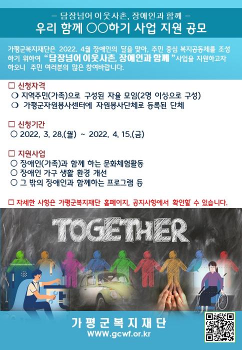 [한국뉴스타임=편집국] 가평군복지재단은 2022년 4월 장애인의 달을 맞아, 이웃이 이웃을 돌보는 공동체적 돌봄 문화 조성과 주민 주도적 돌봄 복지공동체를 조성하기 위하여 장애인과 함께 살기 사업을 추진한다.