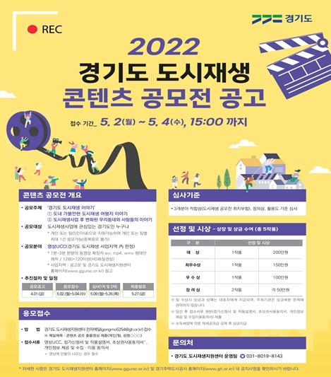 공모주제·분야는'경기도 도시재생 이야기'이며, 도내 가볼만한 도시재생 여행지 이야기나 도시재생 사업 후 변화된 우리 동네와 사람들 이야기에 대한 내용으로 경기도내 63개 도시재생 사업지역 내에서 공모주제와 부합하는 1분에서 3분 이내 창작된 창의적인 영상UCC이면 된다.
