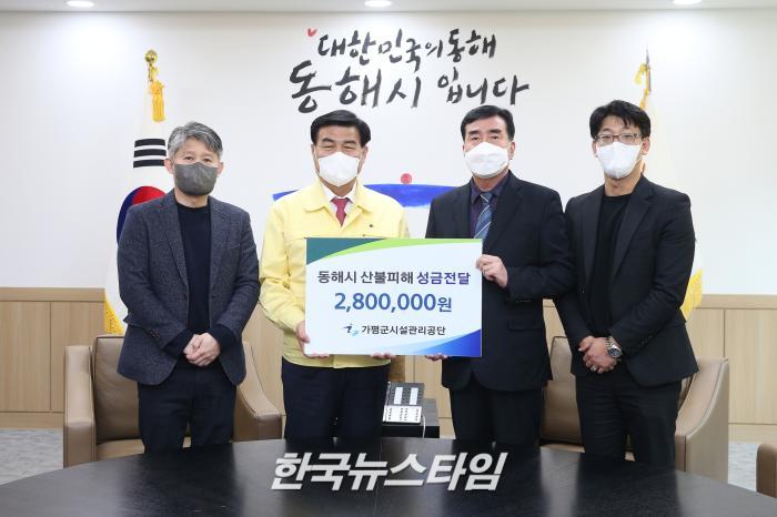 한편, 가평군시설관리공단은 지난 2019년 동해 산불피해 시 동해시시설관리공단과 상호협력 협약을 체결하여 산불피해지역 복구를 위해 무릉계곡 정화활동을 실시하고 이재민 지원을 위해 160여 만원을 기탁한 바가 있다.