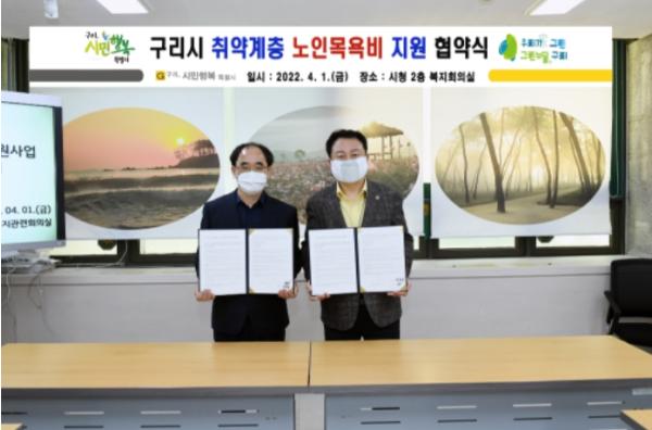 [한국뉴스타임=편집국] 구리시는 4월 1일 저소득 취약계층 어르신들의 건강과 위생을 증진하기 위해 추진하는 목욕비 지원 사업에 추가로 참여하게 될 '인창불한증막사우나(대표 금천수)'와 ‘목욕비 지원사업 협약식’을 개최했다.