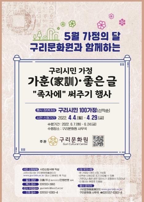 구리시는 가족 간의 의미를 되새기고, 화합과 사랑의 실천으로 보다 아름답고 살기 좋은 “구리, 시민행복특별시”로 거듭날 수 있도록 “구리시민가정 가훈·좋은 글 써주기 행사”를 추진했다.