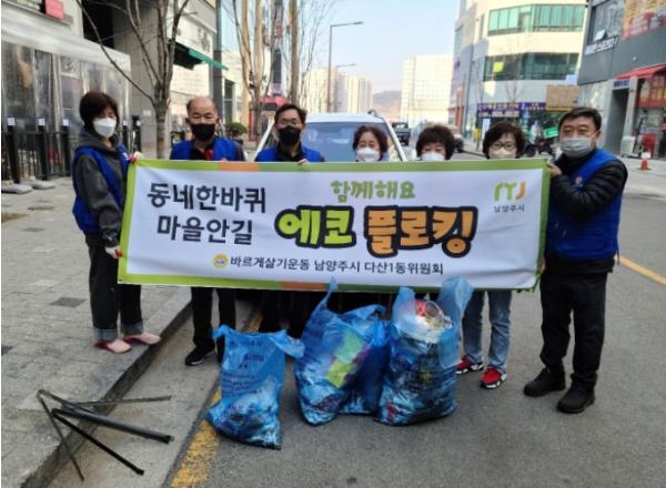 [한국뉴스타임=편집국] 바르게살기운동 남양주시협의회 다산1동위원회(위원장 김수영)는 지난 5일 다산1동 다산선형공원 주변 상가 일대에서 에코플로깅(Eco-plogging) 활동을 펼쳤다.