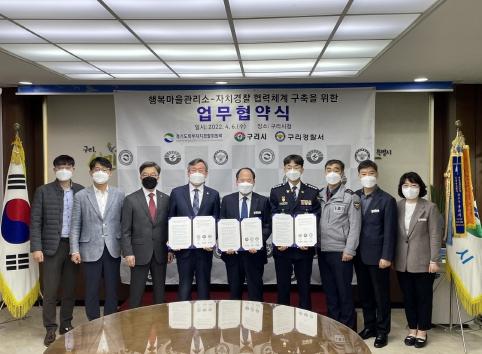 [한국뉴스타임=편집국] 구리시는 6일 구리시청 3층 민원상담실에서 경기북부자치경찰위원회, 구리경찰서와 함께 ‘구리시 경기행복마을관리소’를 중심으로 지방행정-자치경찰 간 협력 강화를 내용으로 하는 업무협약을 체결했다.