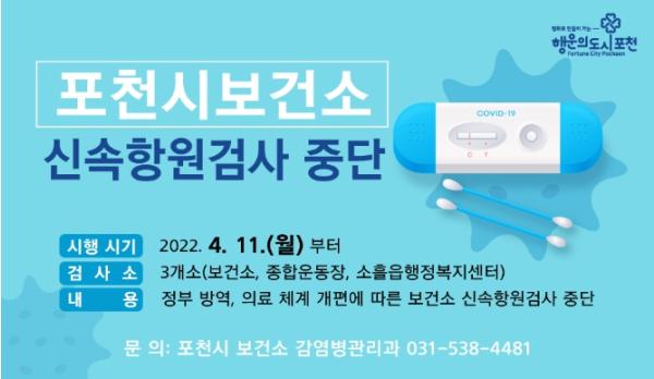 포천시 선별진료소 및 임시선별검사소의 신속항원검사가 중단됨에 따라 신속항원검사를 희망하는 시민은 동네 병·의원을 방문해 전문가용 신속항원검사를 받으면 된다. 다만 60세 이상 또는 의사 소견서를 받은 자, 밀접접촉자 등 검사 우선순위 대상자는 기존처럼 포천시 내 선별진료소와 임시선별검사소에서 PCR(유전자증폭) 검사를 받을 수 있다.