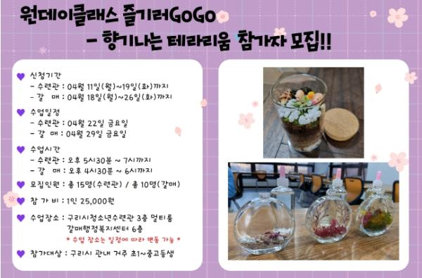 [한국뉴스타임=편집국] 구리시청소년재단은 2022년도 4월“원데이클래스 즐기러GoGo ? 나만의 아이템 만들기” 프로그램인 ‘향기 나는 테라리움’을 실시한다.