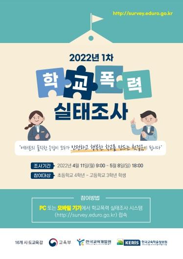 이번 실태조사는 초등학교 4학년부터 고등학교 3학년 학생을 대상으로 2021년 2학기부터 현재까지 학교폭력 목격, 피·가해 경험과 인식 등을 조사한다.