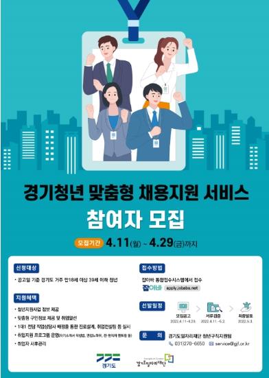 [한국뉴스타임=편집국] 경기도가 청년구직자에게는 맞춤형 구인정보 등을 제공하고, 구인기업에는 우수 청년 인재를 추천하는 ‘경기청년 맞춤형 채용지원 서비스 사업’에 참여할 청년과 기업을 11일부터 29일까지 모집한다.